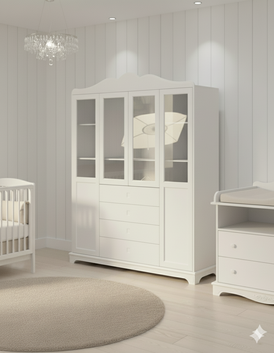 Com 4 portas e 4 gavetas espaçosas, o modelo Imperial oferece organização impecável para roupas, acessórios e brinquedos. Seu interior inteligente conta com 10 prateleiras e 1 cabideiro, aproveitando cada centímetro de espaço de forma eficiente.