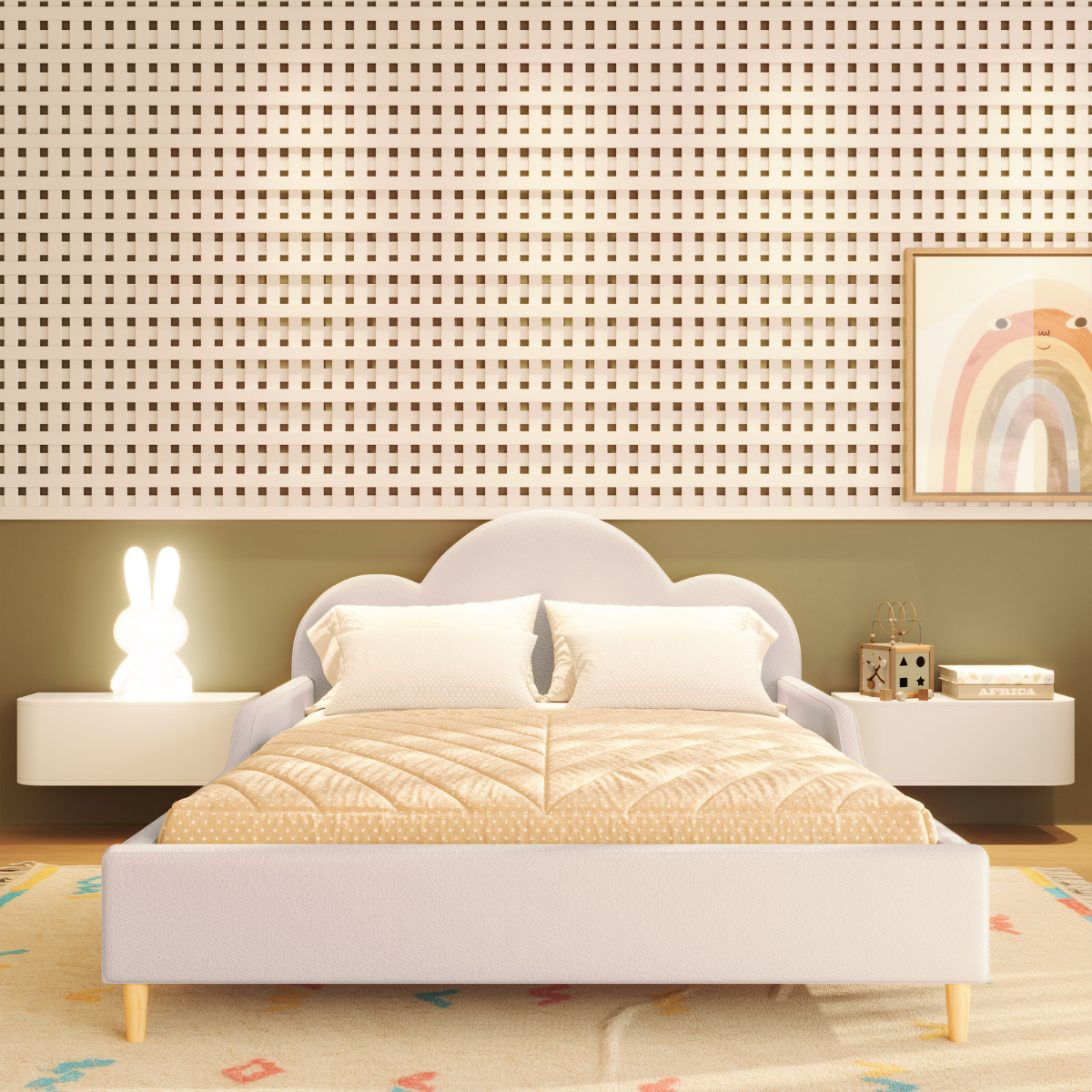 Transforme o quarto infantil em um espaço acolhedor e cheio de encanto com a Cama de Casal Estofada Nuvem Coleção Algodão.